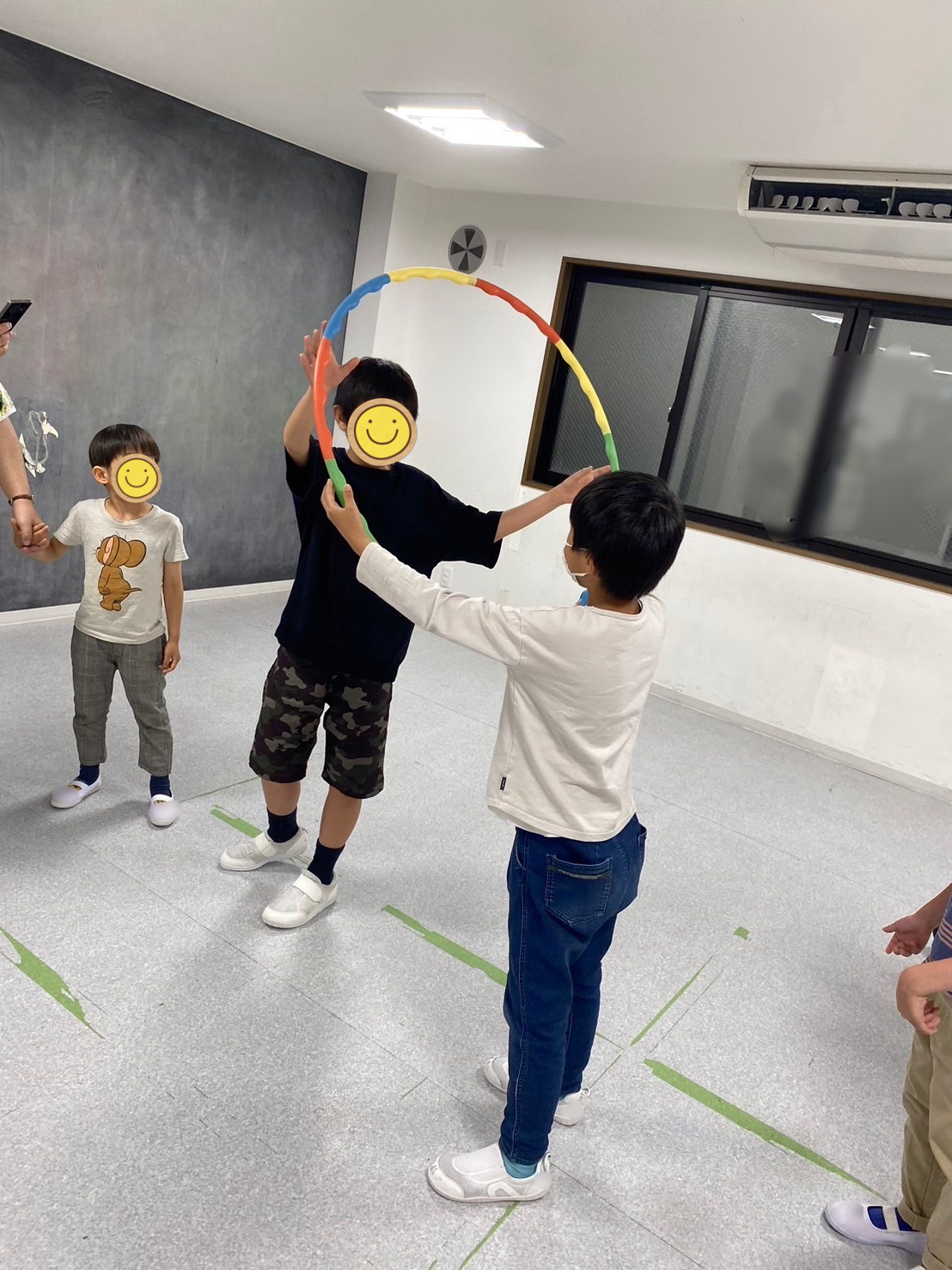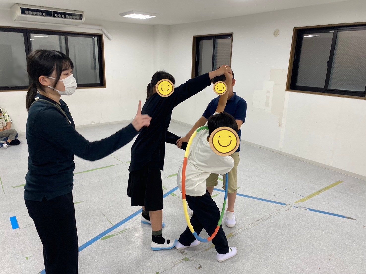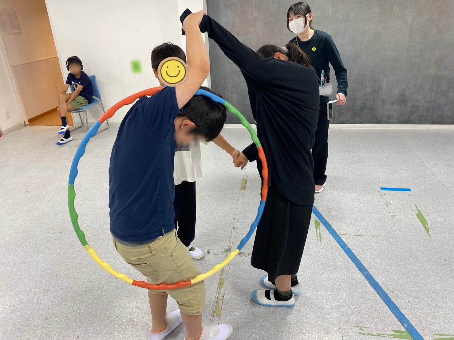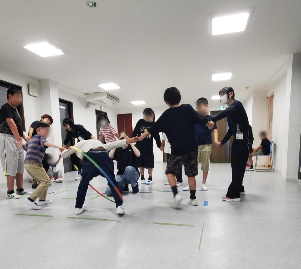 - グループに分かれて、手を繋いでフラフープをくぐる