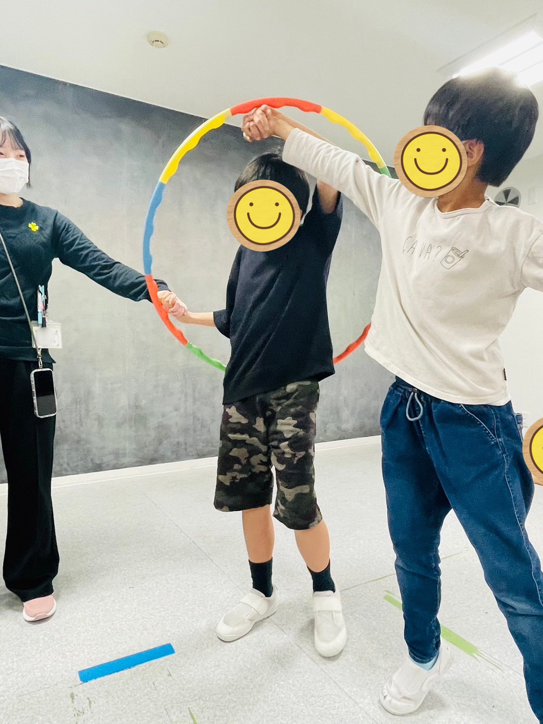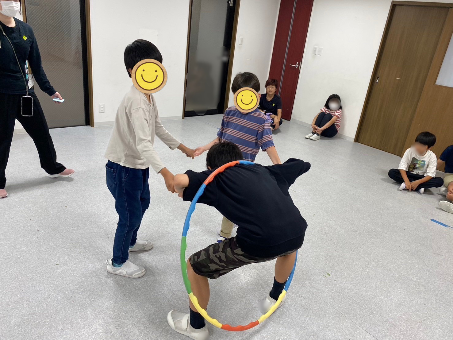 - 全員で大きな円になってフラフープくぐりに挑戦🔥