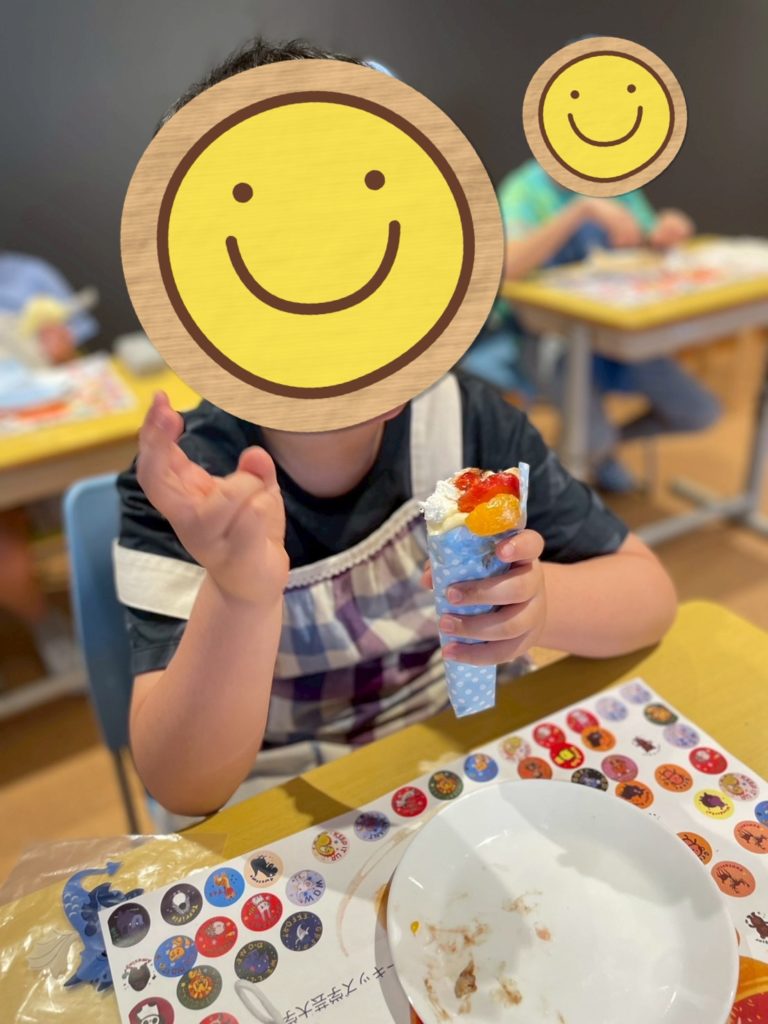 その後、別の机に移動してクレープを包みます。子どもたちと一緒にやりましたが、とても苦戦しました💦