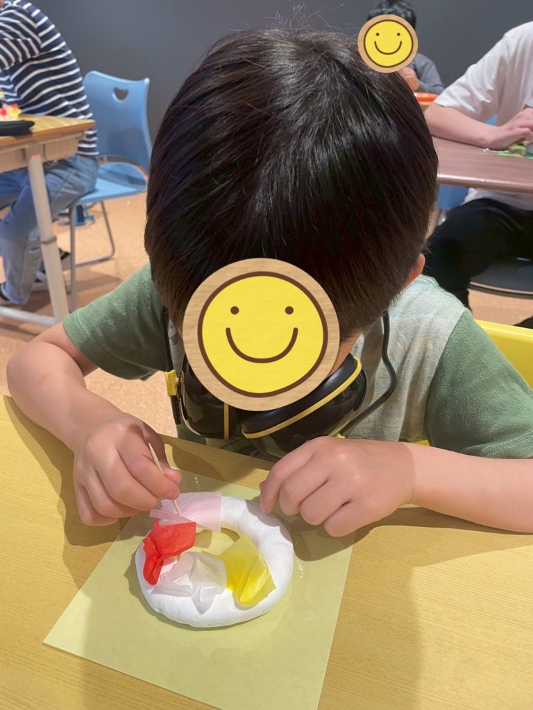 紙粘土でドーナツ型の土台を作り、爪楊枝のお尻側で花紙を押し込みます!花紙を粘土に埋め込む独特の感覚が楽しい✨️