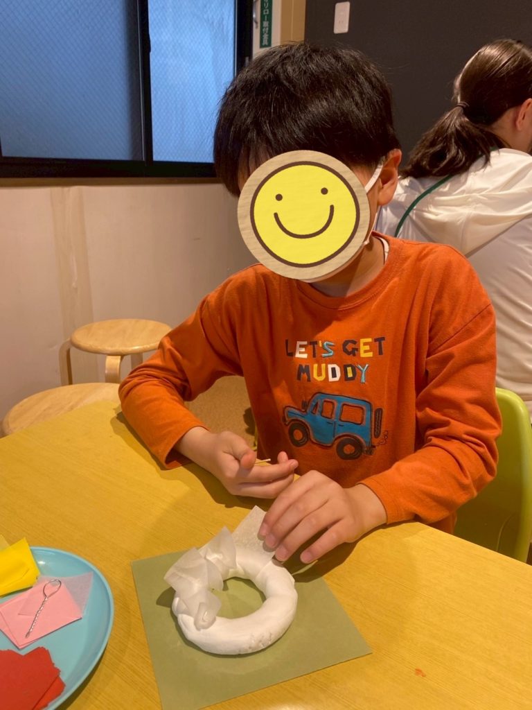 先日、クローバーキッズ学芸大学では工作プログラムで「お花のリース」を作りました🌸