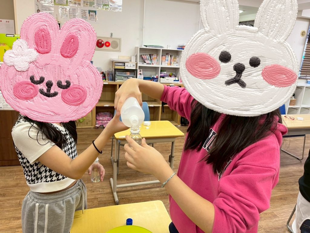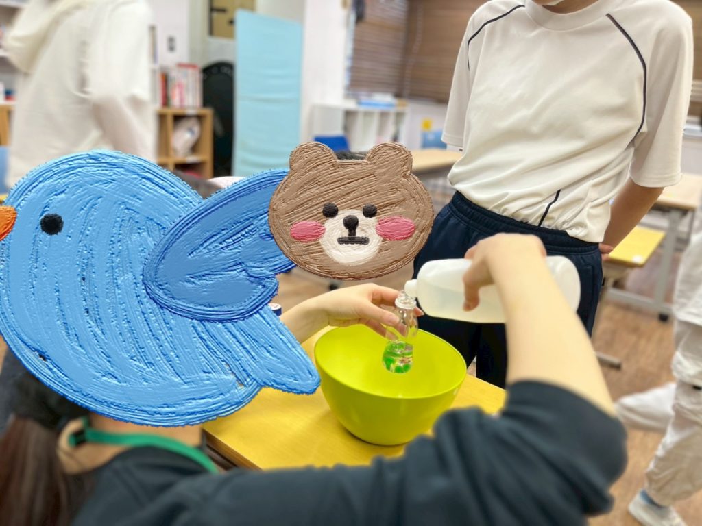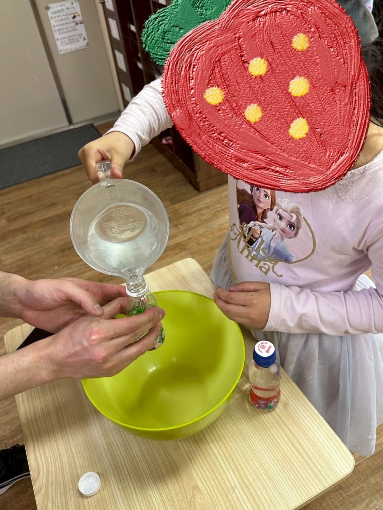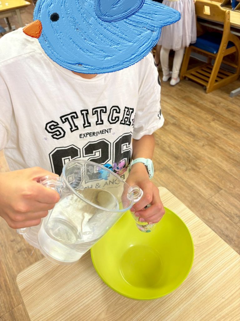 早く動くセンサリーボトルを作りたいか、ゆっくり動くセンサリーボトルを作りたいか、自分の希望を伝えて、入れる糊の量を調節します🚰