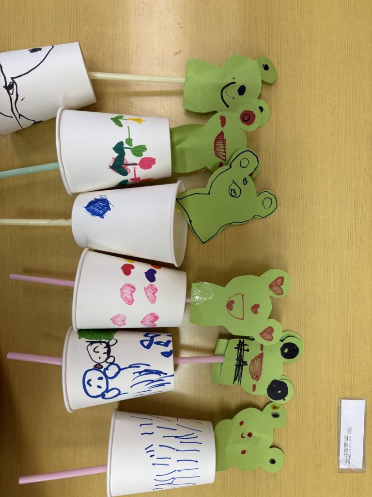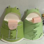 出来上がったカエルは、セロハンテープでしっかりと貼りつけて、紙コップの底の穴に入れると仕上がります!