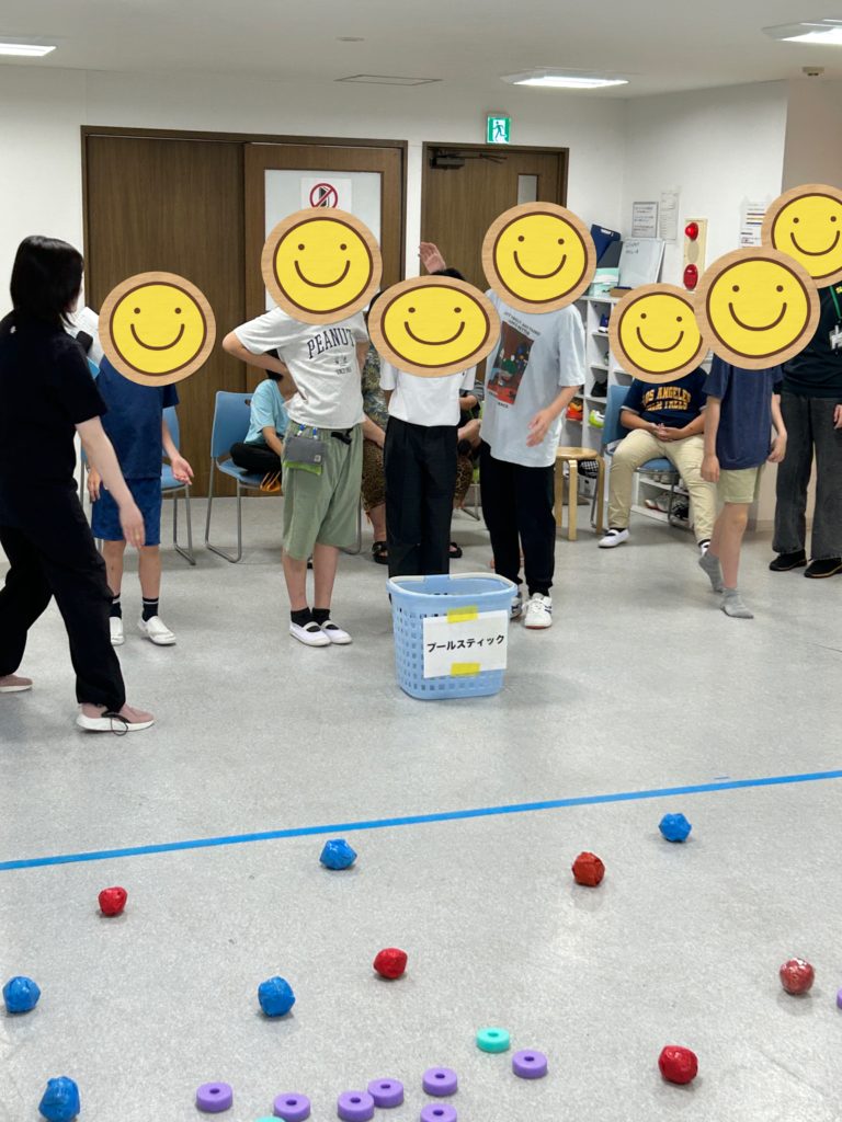 まずは赤玉、青玉、プールスティックの3つです。グループごと制限時間内に指定されたカゴ🧺にお片付けをしていきます。たくさん散らばっているので、分担をしてお片付けをしているグループもありました🧐