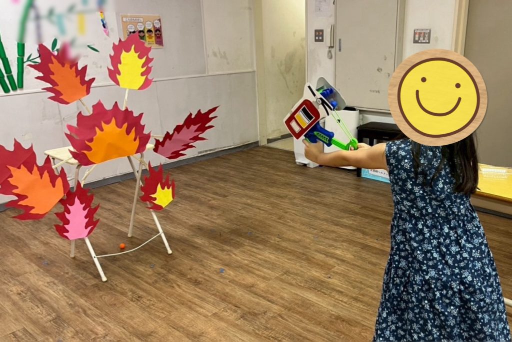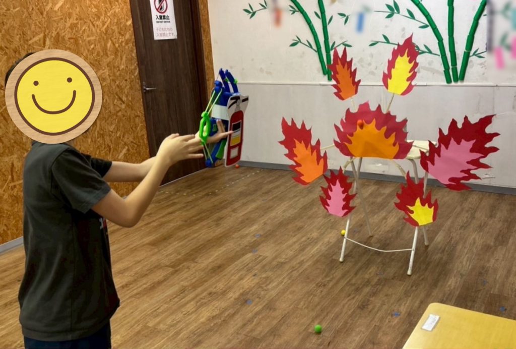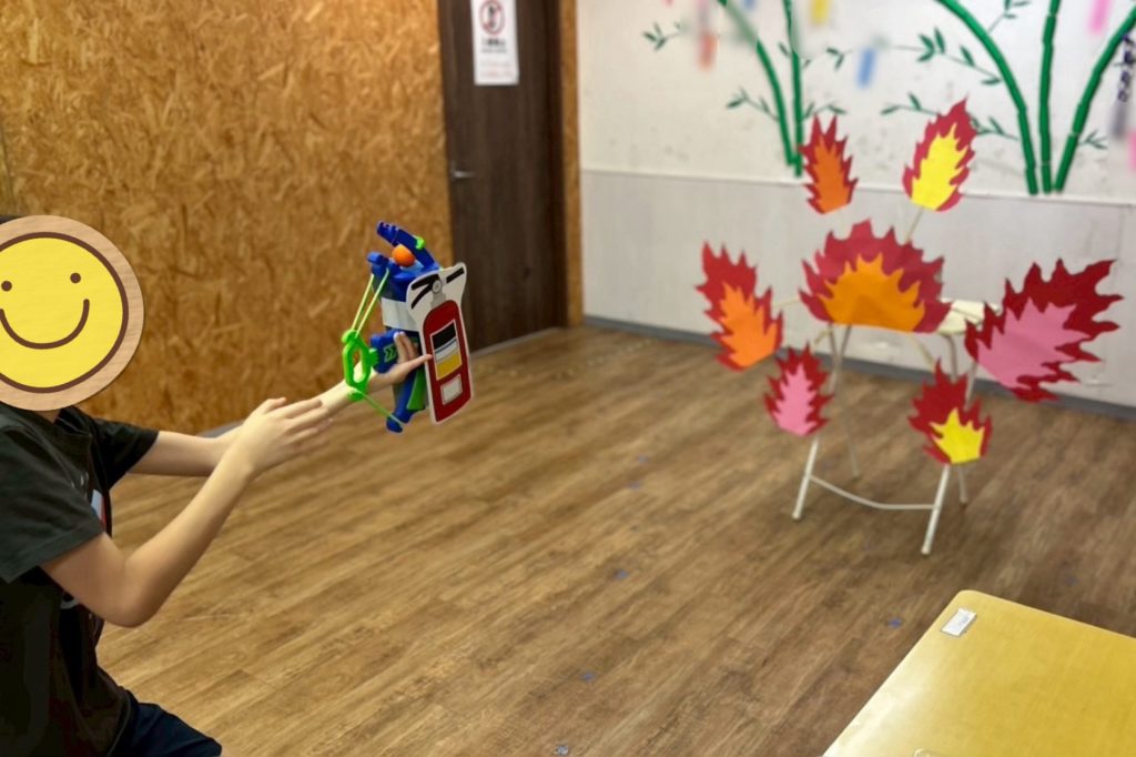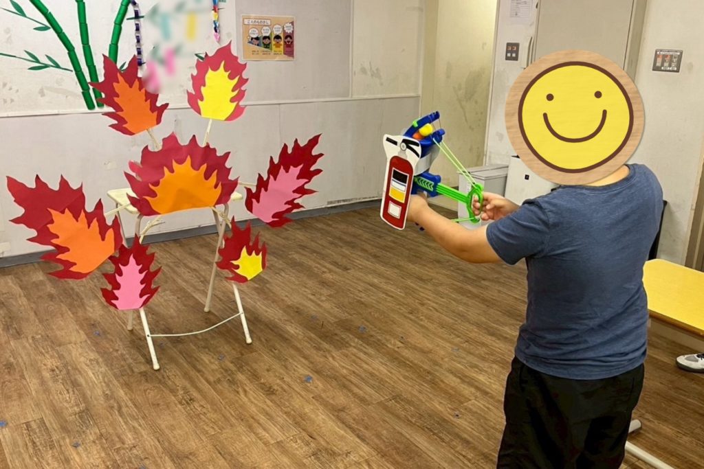 この特製消火器(アーチェリーおもちゃ)で、燃え盛る炎を鎮火してください‼️