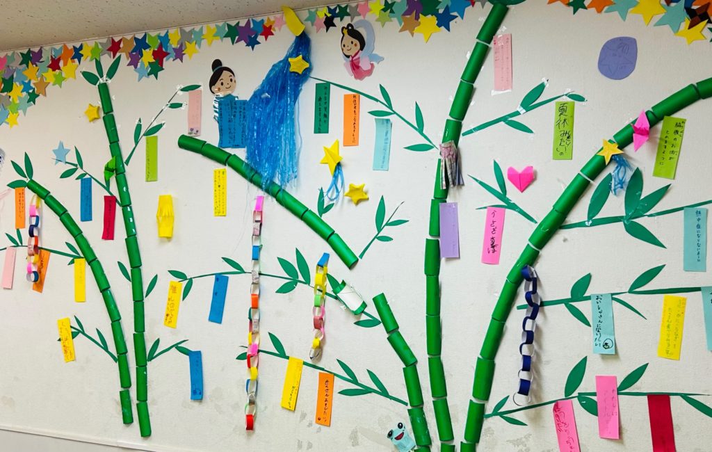 七夕に合わせて、職員と子ども達で壁飾りを作りました🎋星を切ったり飾りを一緒に作ったりと、華やかなものになりました✨
