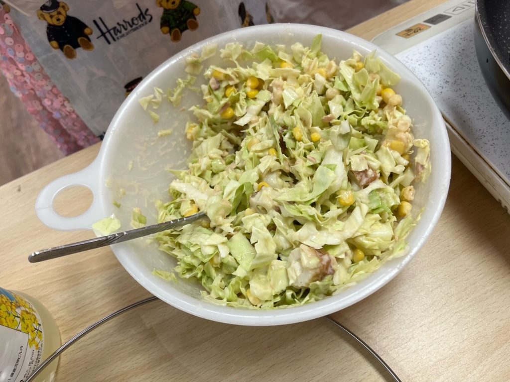 できたら、天かす、ちくわ、コーン、ツナ、卵、マヨネーズを入れて再度混ぜ合わせます🌀