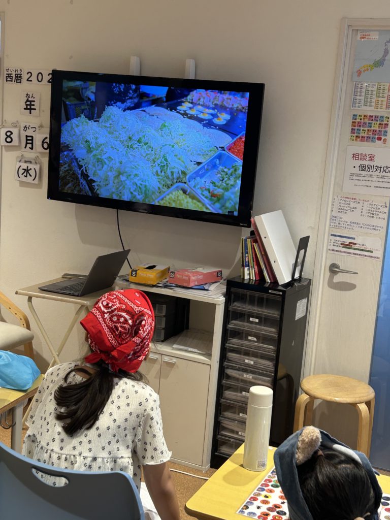 全員の分が完成するまでの間、本場の広島風お好み焼きの作り方を動画で観ました!「具が多すぎて溢れてる!」「ここからどうやるんだろう?」ととても興味津々でした😊