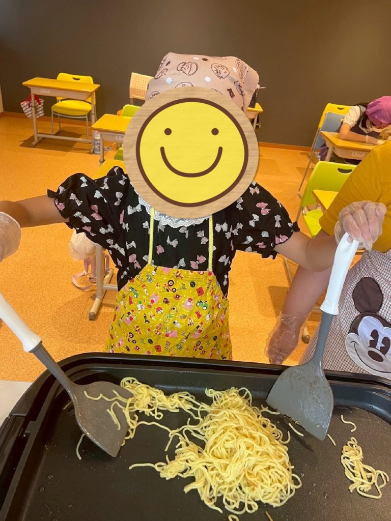 焼きそば作りは鉄板に麺を入れてヘラを使って混ぜていきます!油が跳ねるのを怖がる子いましたがヘラを上手に使い混ぜられました♪