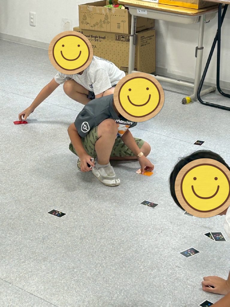 床に散らばった7色のカードをめくって同じ色カードを見つける遊びです!