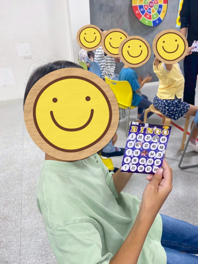 ビンゴをしたら「ビンゴ〜!!」と大きく立ち上がり先生と確認しました♪