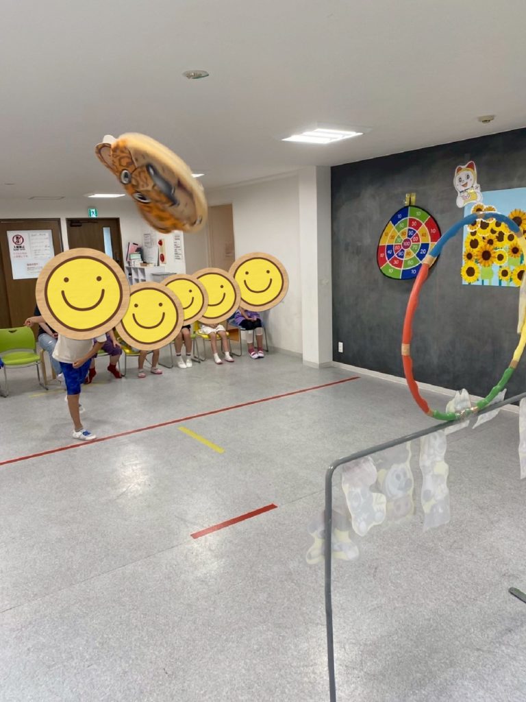 動物の顔のフリスビーを5回投げ、フラフープの中に通すことができたら成功!