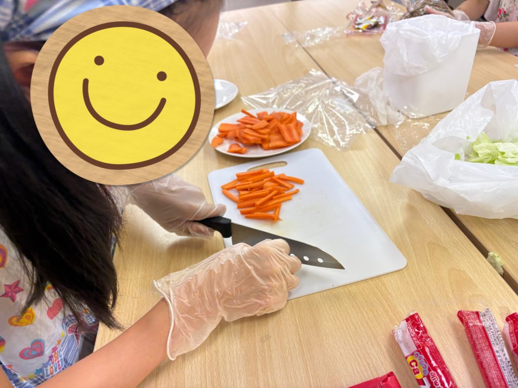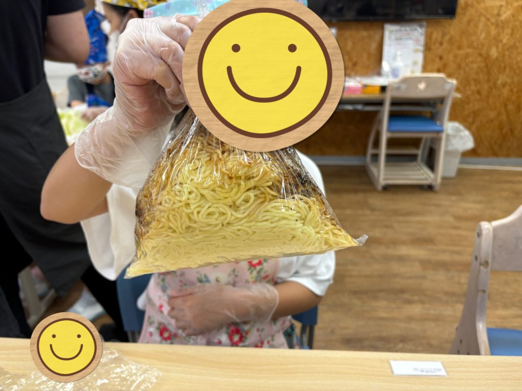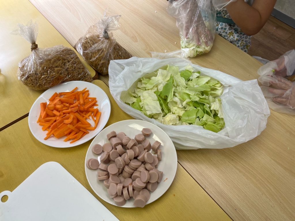 キャベツを手でちぎる係、にんじんと魚肉ソーセージを包丁で切る係、そして麺を袋の中でほぐす係に分かれました。それぞれが自分の役割に集中し、器用に手を動かしてスムーズに作業を進めることができました😉