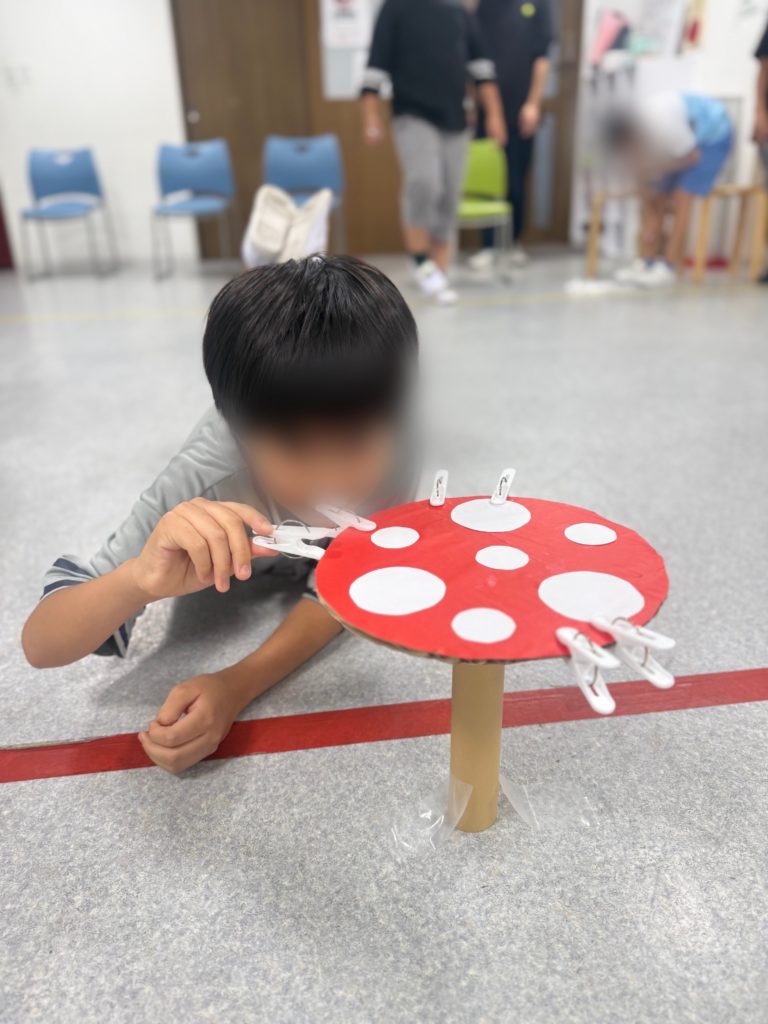 きのこの傘の部分に、傘を落とさないよう洗濯バサミを順番に付けていくゲームです🍄今回は、チームに分かれてリレー形式で行いました✨