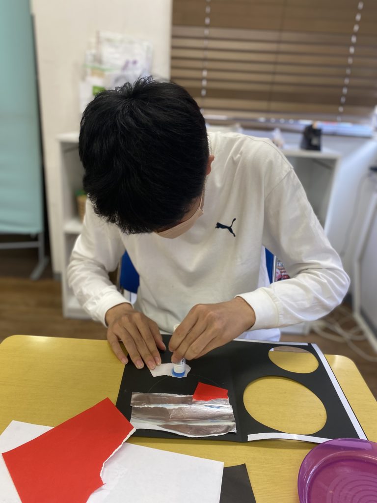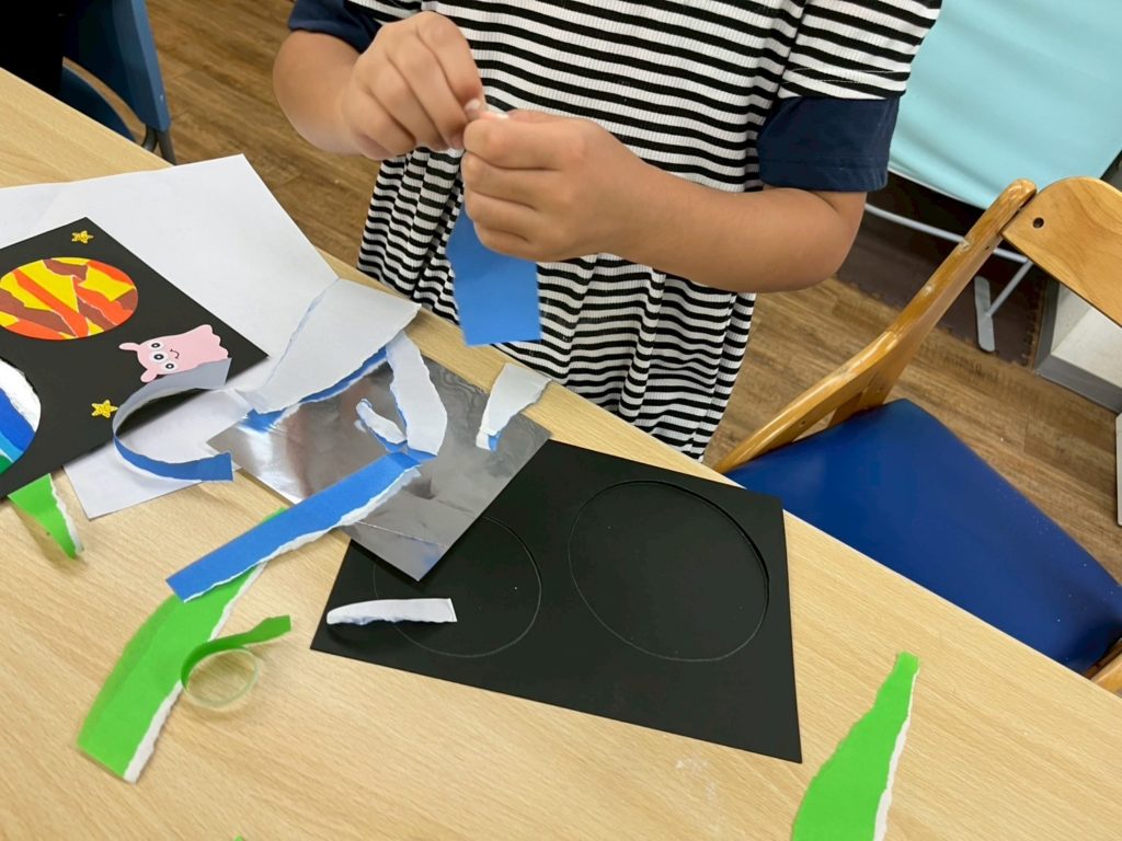 折り紙をちぎって糊で貼り付け、惑星をイメージした作品を完成させていきます✨️