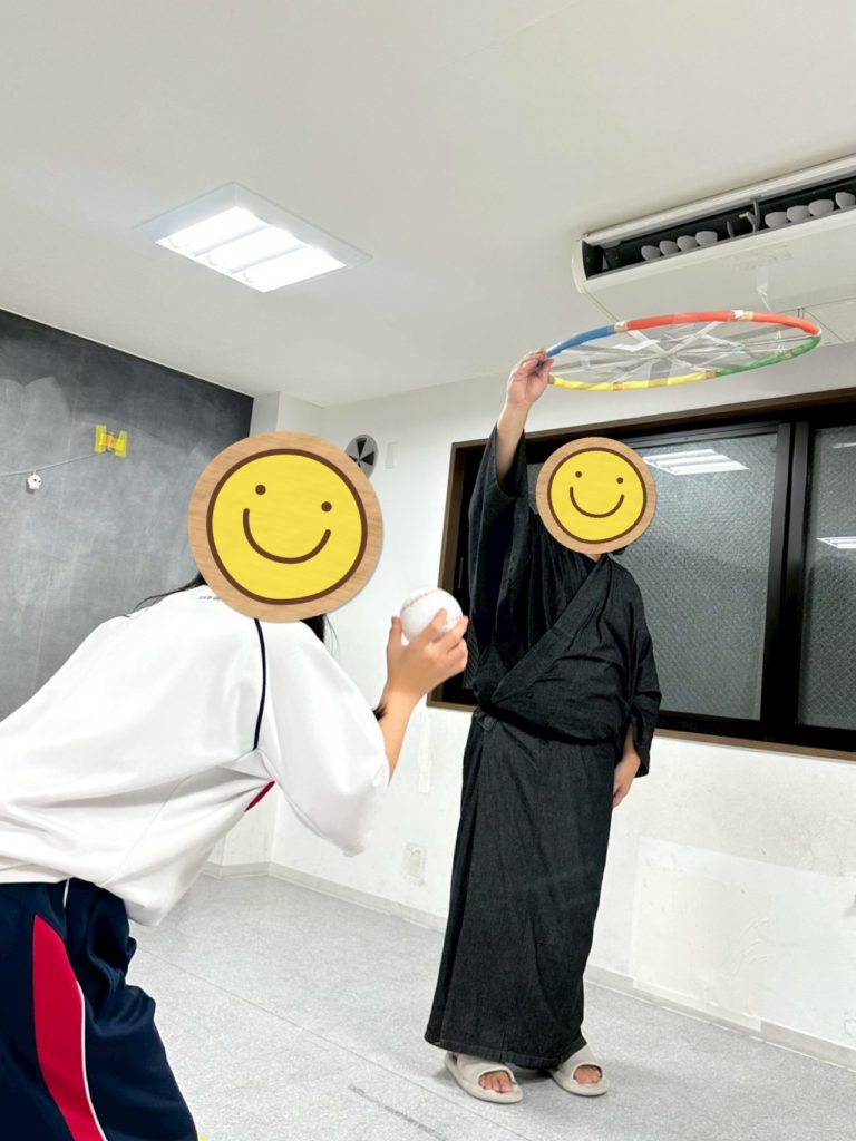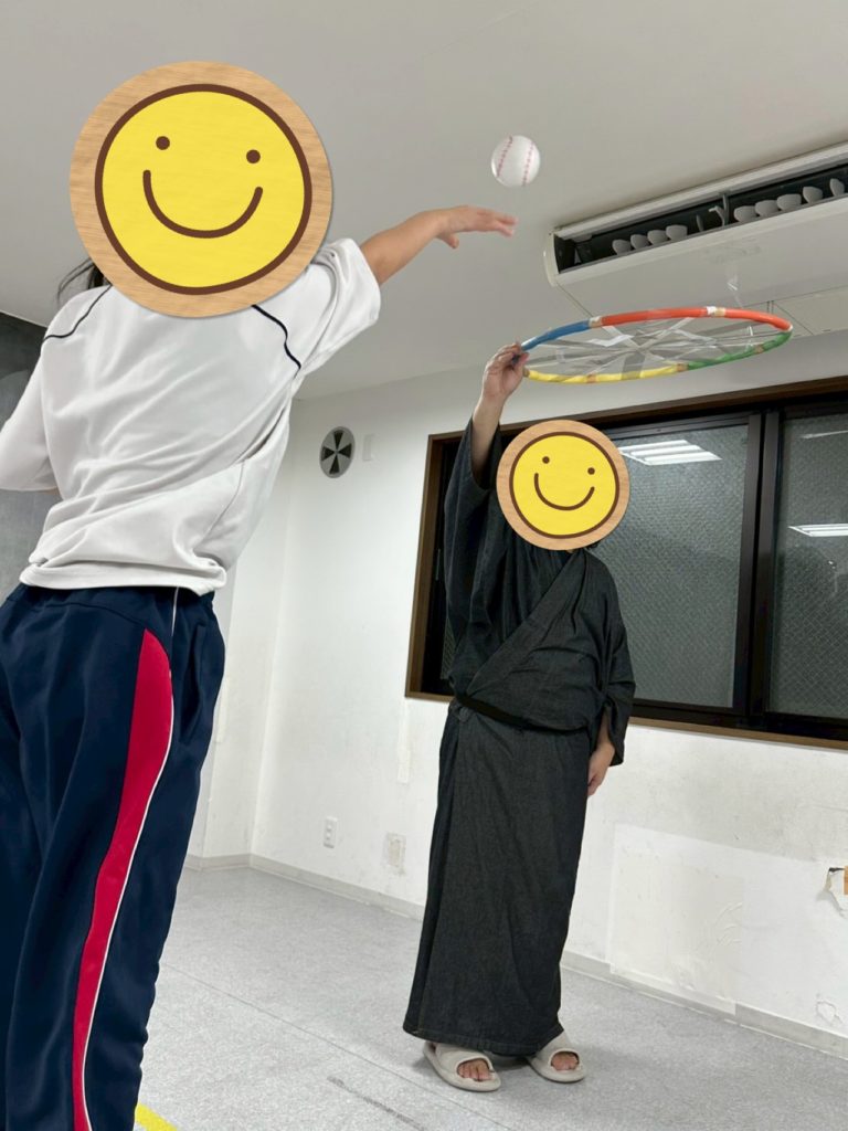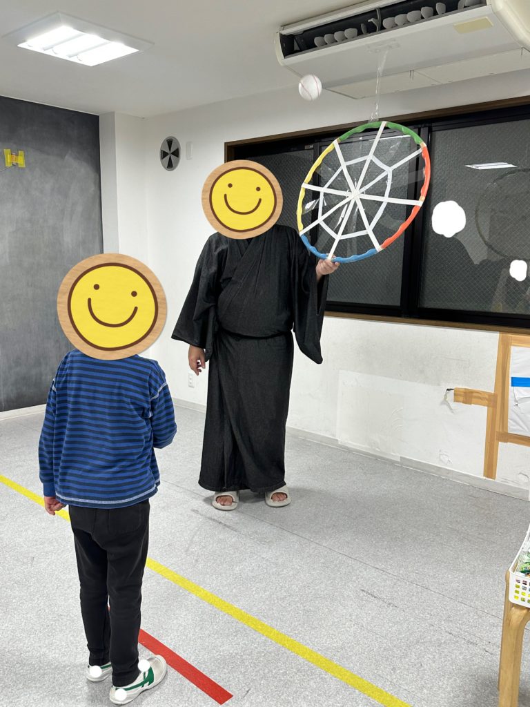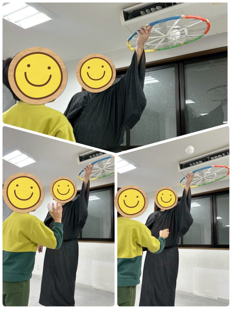 天井から下げられた蜘蛛の巣の的に向かってボールを投げていきます!