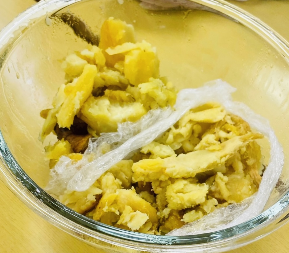 あっという間に5分が過ぎ、アツアツの焼き芋を交代しながら混ぜていきましょう‼️