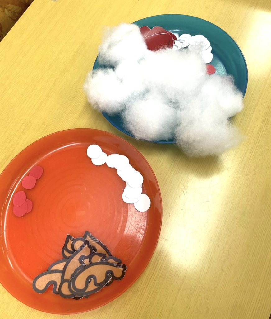 まずはサンタとトナカイ、どちらを作るかを決めて顔のパーツを貼っていきました😊