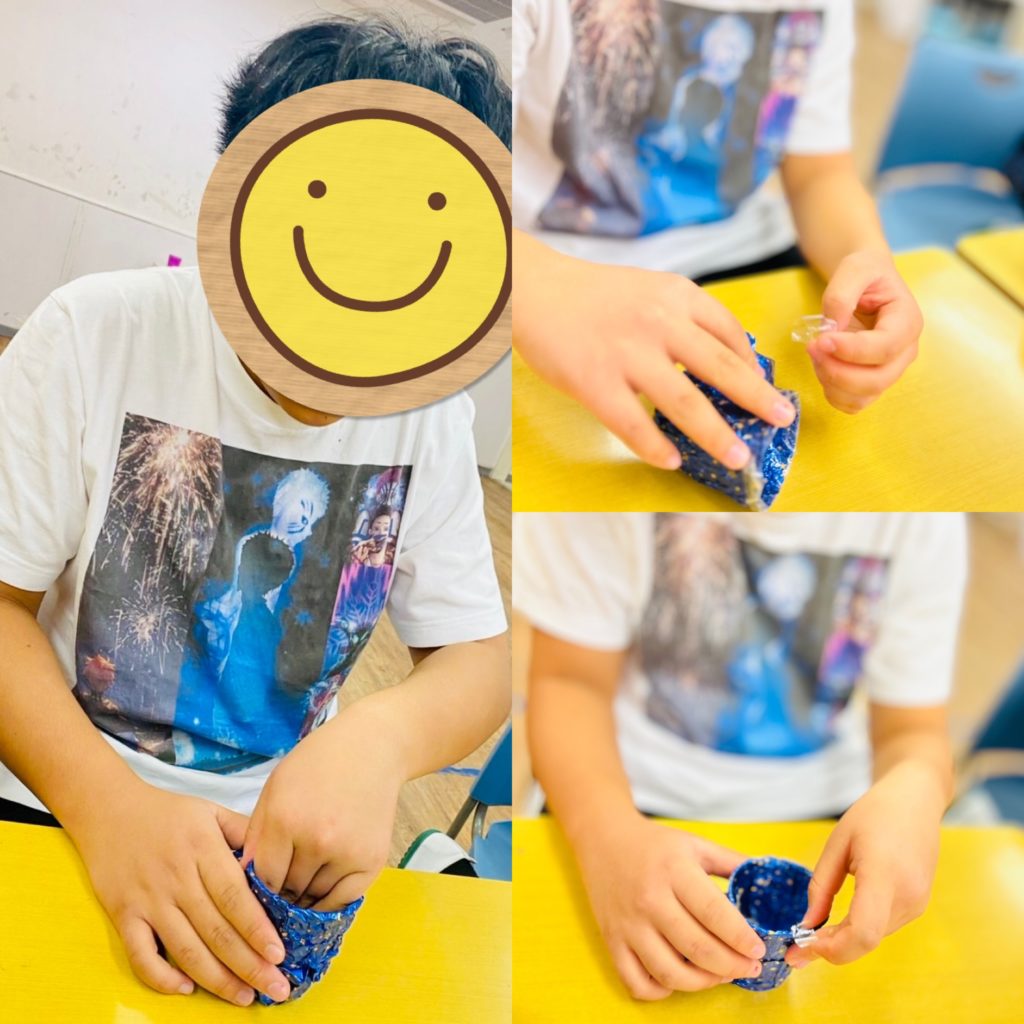 まずは、紙コップで作った骨組みにアルミホイルを破かないように優しく包んでいきます!