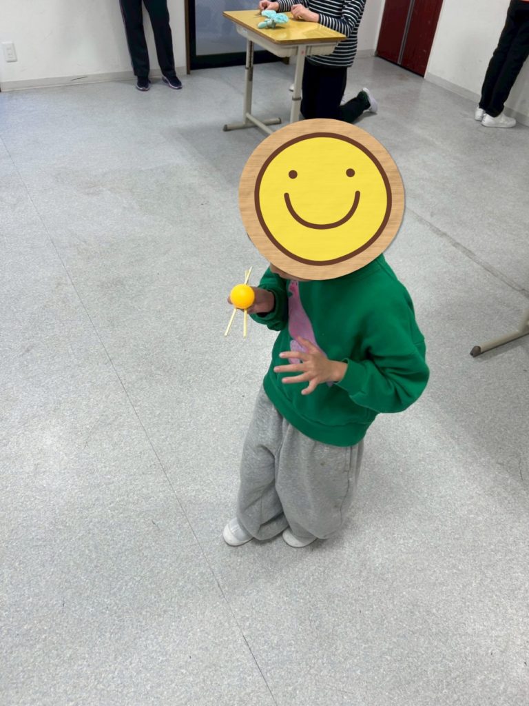 3つ目は割り箸にピンポン球をはさんで運びます。1番難易度が高く、「私お箸苦手なんだよ🥢」「これは難しいよ」と不安の声がたくさんありました。