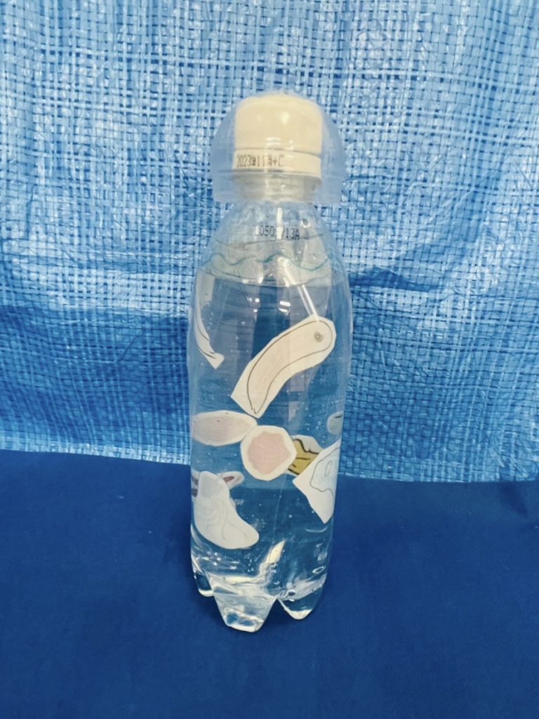 自分たちで描いた絵、お気に入りの海の生き物たちをラミネートしてペットボトルに丸めて入れたら…オリジナル水鉄砲の完成❕🐬