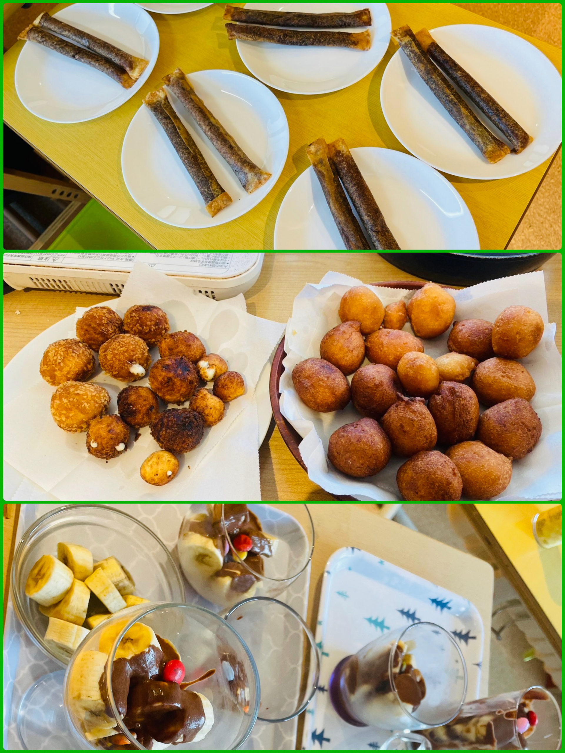 たこ焼きせんべい、春巻きチョコスティック、チーズボール、チョコバナナ……。さまざまな手作りおやつを美味しくいただきました😊