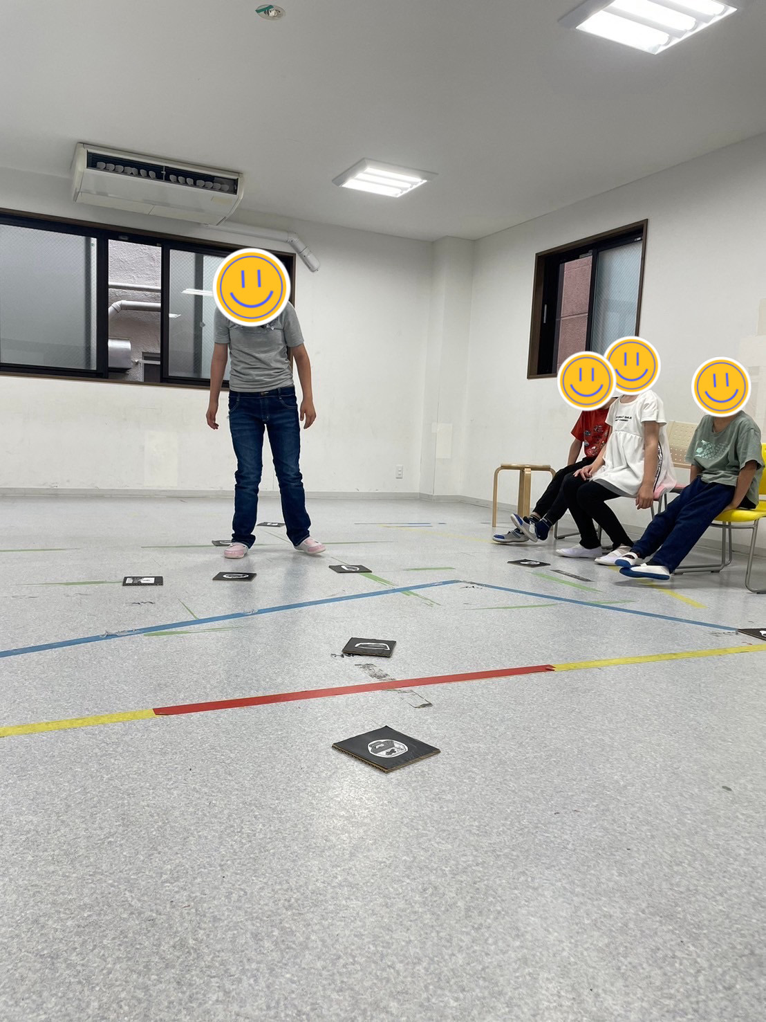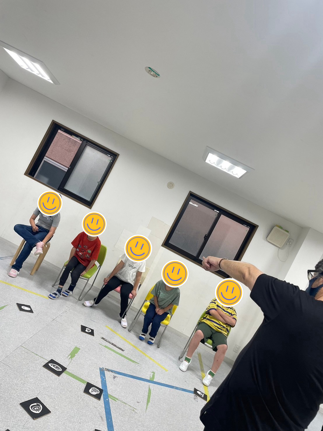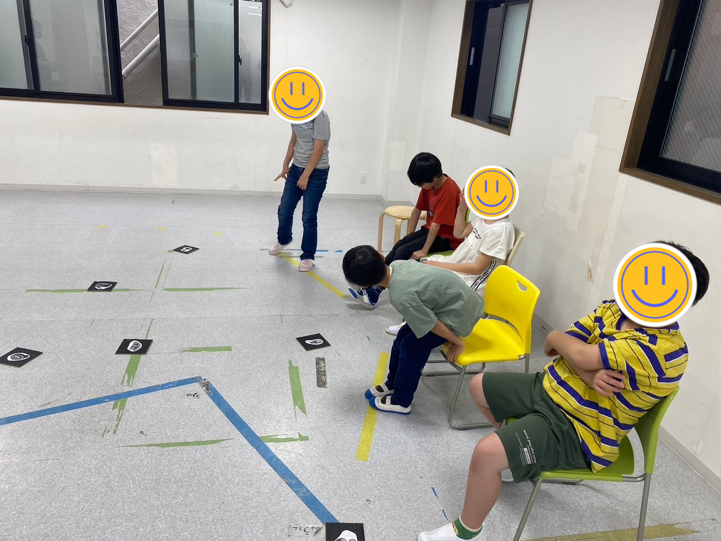 ①様々な絵が描かれたカードを床にばら撒き、ゲーム開始!